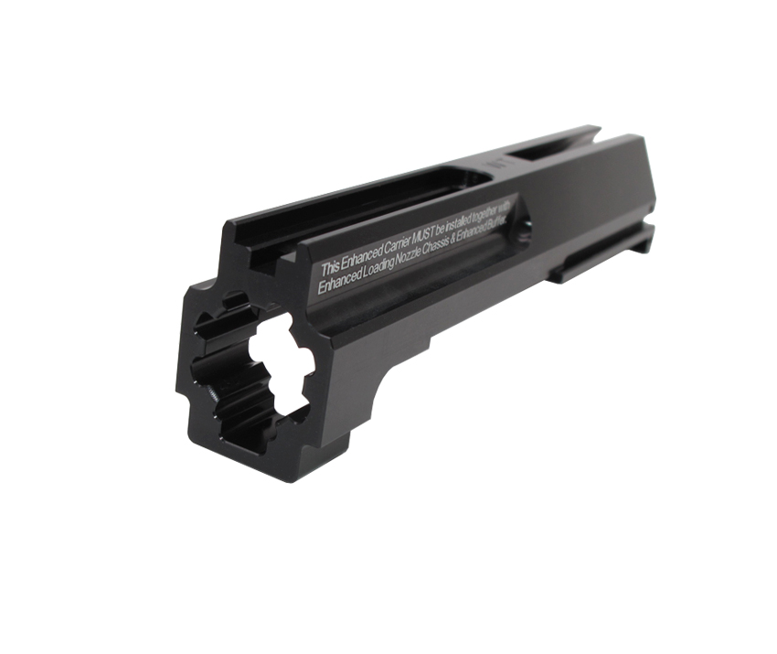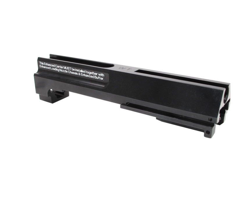 This 6061 aluminium Enhanced Carrier is made by precision CNC machines and hardcoat-anodized finishing. The Enhanced Carrier MUST be used together with our Version 2 Enhanced Loading Nozzle Chassis (item No.4145) and Enhanced Buffer (item No.4144) for MP9 (KSC-System 7) with Green colour piston on chassis (i.e. Asia version).
