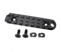 This aluminum rail is a 11 slots M-LOK rail with steel screws and nuts. It is made by precision CNC machines, thererfore it is perfectly fit standard M-LOK system. One end of the rail fits QD adapter. The rail can be installed 'back and forth' and it has matt black hardcoat-anodized finishing.